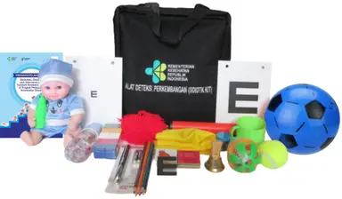 - Tas Berbahan canvas hitam dengan resleting, bertuliskan ALAT DETEKSI PERKEMBANGAN (SDIDTK KIT) dilengkapi dengan logo kementrian kesehatan.