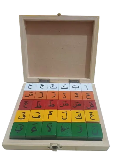 balok kayu ukuran kurang lebih 2,5×2,5×2,5 cm dengan sablon huruf hijaiyah pada keenam sisinya, 5 warna dipacking dalam tas tertutup berhandle dari bahan kayu dan MDF