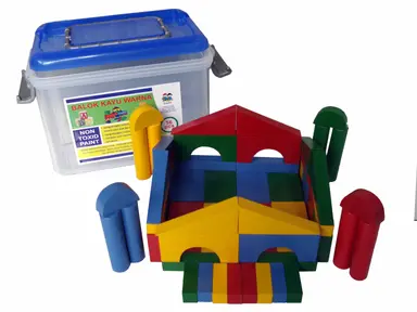 Balok Warna Terdiri dari 56 pcs balok ( mini ) warna – warni dari bahan kayu kering oven, memakai cat non toxid. Tempat penyimpan dalam box / container plastik dengan tutup berhandle. Packing luar srink PP.