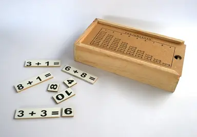 Tempat penyimpan berupa box dari bahan kayu kering oven ukuran ± 23 x 12,5 x 5 cm dengan tutup sliding dari bahan MDF non formalin yang telah disablon bentuk penjumlahan 1 s/d 9. Packing plastik srink PP.