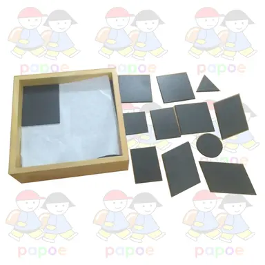 Terdiri dari 8 macam geometri besar ( lingkaran Ø 7 cm, segitiga 7 cm x 7 cm, persegi panjang 9 cm x 7 cm , bintang 9 cm x 9 cm, jajaran genjang 9 cm x 8 cm, oval Ø 9,5 cm x 7 cm, bujur sangkar 7 cm x 7 cm, dan hati 9,5 cm x 9,5 cm ), dengan ketebalan 0,3 cm, masing – masing geometri berwarna hitam.