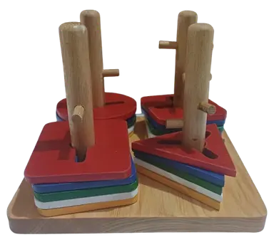 1 tiang / dowel memuat 1 bentuk geometri sebanyak 5 pcs, 5 warna.