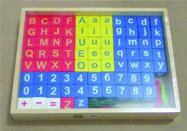 Berupa box/kotak berukuran 36×26,7×6 cm yang didalamnya terdapat 4 pcs tali dan 80 pcs kubus yang terdiri dari huruf, angka dan simbol matematika dari bahan kayu, MDF dan tali.