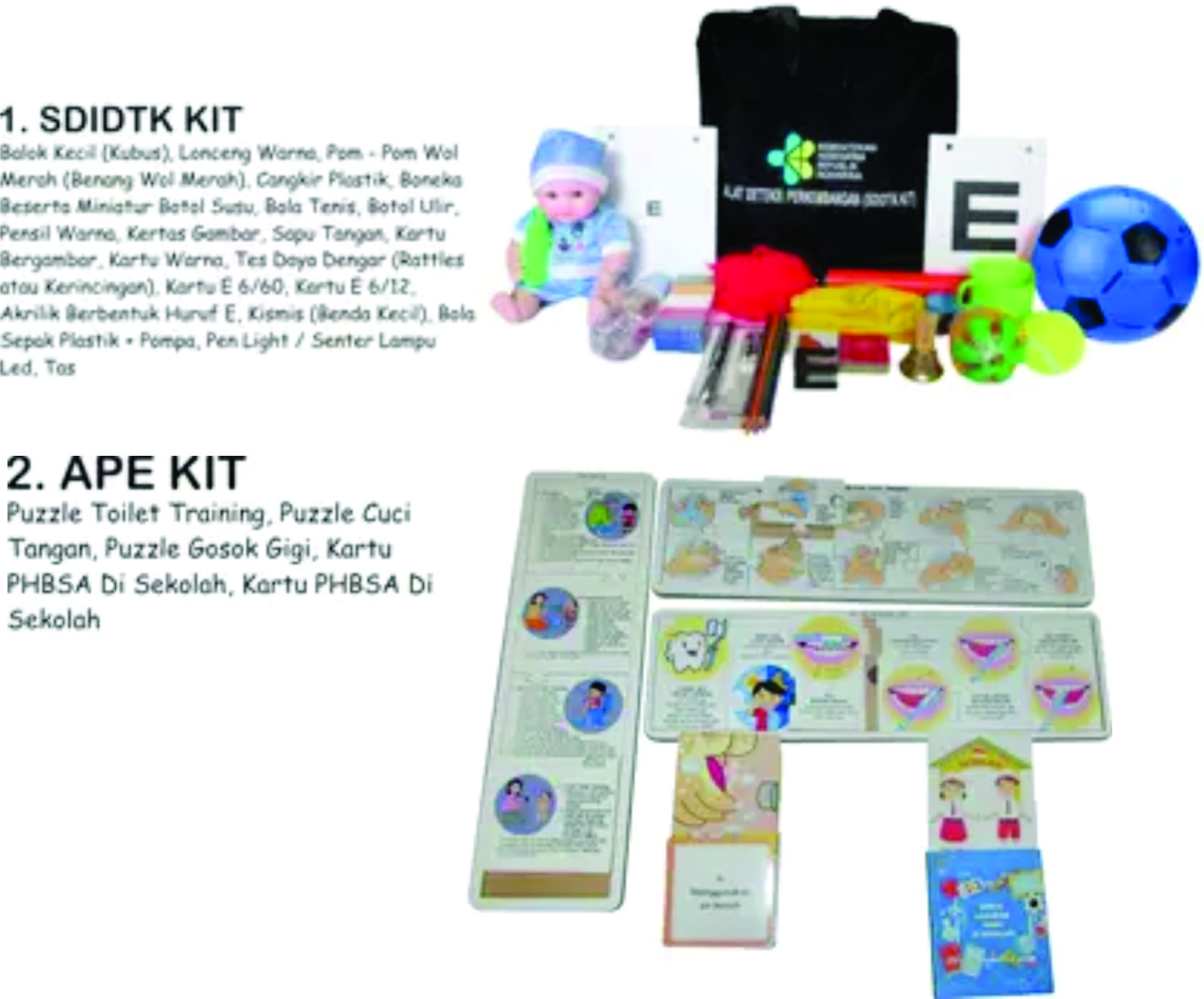 Dalam satu paket terdiri dari satu paket SDIDTK dan APE Kit, yang berisi puzzle toilet training, puzzle cuci tangan, puzzle gosok gigi, kartu PHBSA dirumah, dan kartu PHBSA disekolah.
