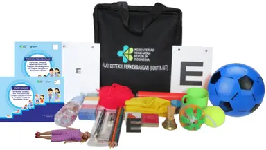 - Tas Berbahan canvas hitam dengan resleting, bertuliskan ALAT DETEKSI PERKEMBANGAN (SDIDTK KIT) dilengkapi dengan logo kementrian kesehatan.