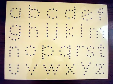 Papan yang bergambar pola lubang huruf a – z sehingga bisa dijahit, disertai 3 utas tali kur.