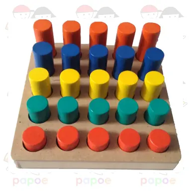 Pasak bentuk silinder ukuran Ø 2,5 cm dengan tinggi 3,5 cm; 4,5 cm; 5,5 cm; 6,5 cm; 7,5 cm. Disusun per kelompok ukuran dari terendah s.d tertinggi, masing – masing kelompok ukuran berbeda warna.