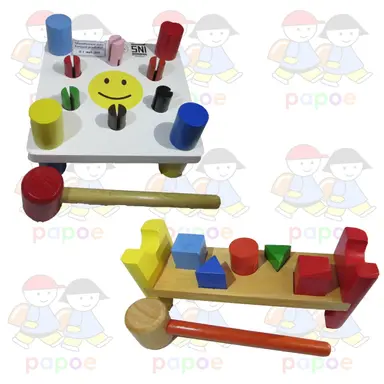 Pukul / Palu Besar : Papan berpasak 6 dapat dipukul bolak balik, dilengkapi pemukul / palu ( ukuran : + 18 cm x 18 cm x 10 cm ) Ukuran pasak disesuaikan dengan ukuran papan secara proporsional. Lubang pasak tidak longgar dan tidak sempit. Pukul / Palu Geometri : Papan dengan 5 buah pasak bentuk geometri, dapat dipukul bolak balik dan disertai dengan pemukul ( ukuran : ± 23 cm x 7 cm x 9 cm ). Bahan : kayu, finishing cat non toxic. Dikemas dengan plastik press.