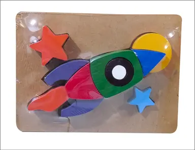 Puzzle bentuk roket disertai alas. Ukuran jadi kurang lebih 240 x 175 x 40 mm. Bahan kayu & MDF. Warna non toxid. Packing plastik srink PP.