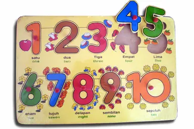 Puzzle ukuran ± 30 x 20 x 0,8 cm bergambar angka 1-10 disertai gambar benda sebanyak angka tersebut, potongan puzzle tepat sesuai bentuk angkanya sehingga mudah dibongkar dan dipasang serta bisa dipakai untuk kegiatan menjiplak. Terdapat handle pada setiap potongannya. Dibuat dari bahan MDF non formalin, pewarnaan mamakai cat non toxid dan packing plastik srink PP.